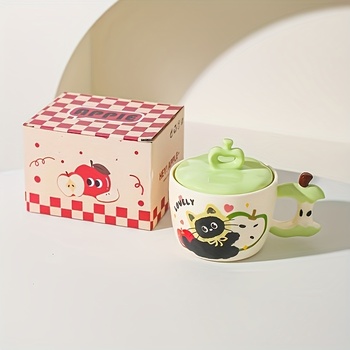 Cartoon Cat & Apple Ceramic Mug with Lid, Handmade Ceramic Cup, Kawaii Style Drinkware, Multi - Purpose for Coffee/Tea/Milk